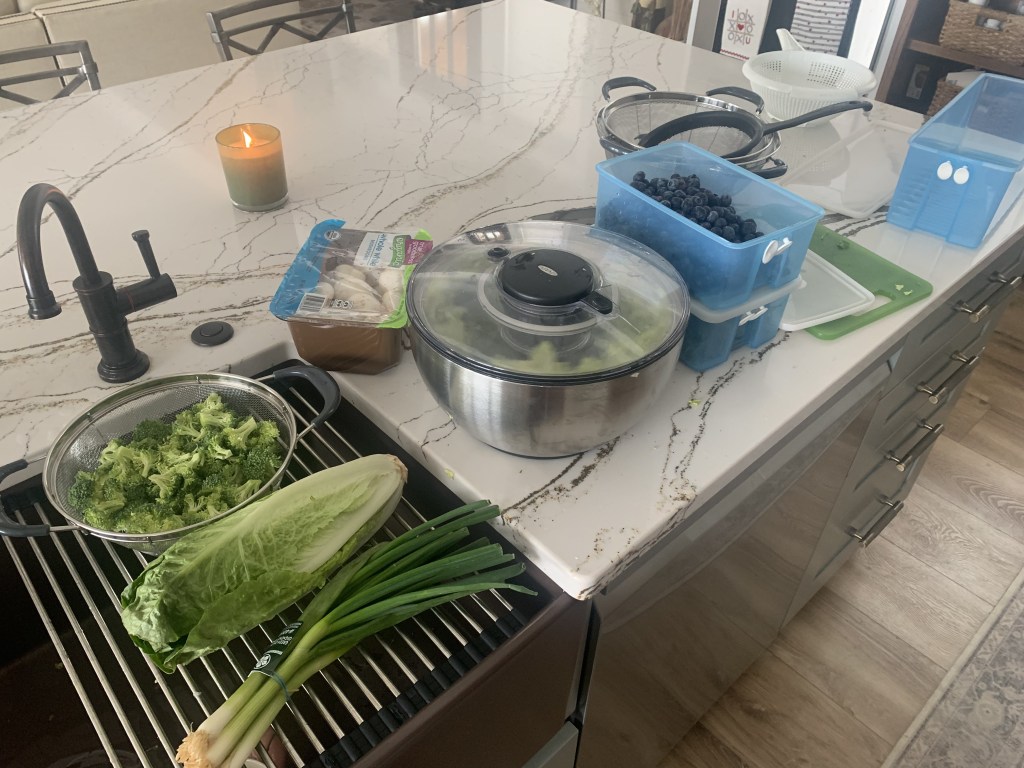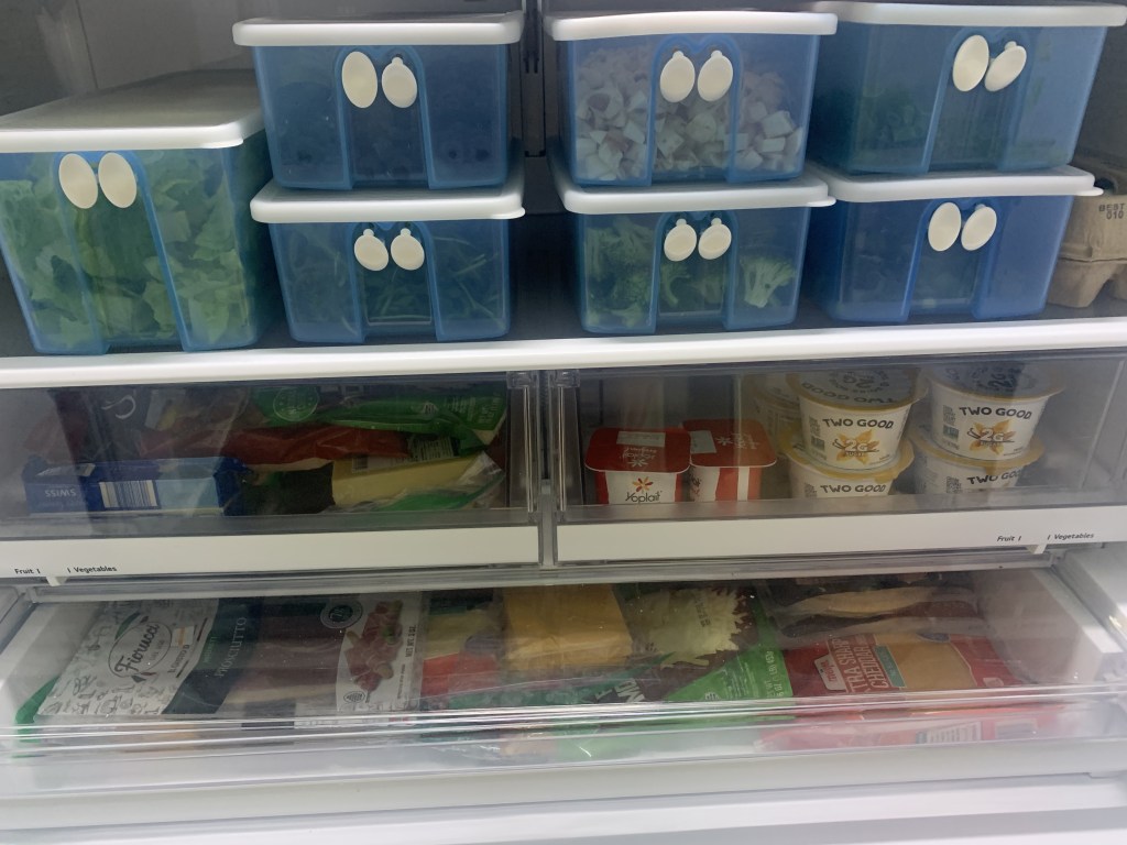 By doing this food prep, I can easily mix up my salads and its easy to have a salad once or twice a day. Also, I like to buy vegetables that I can cook right before they go bad so it gives them an extra shelf life. For this reason, I’ll buy spinach sometimes instead of lettuce, but we do love our lettuce so we just focus on eating it up before it goes bad. The key is to not over buy for what you can eat so your always have fresh vegetables.