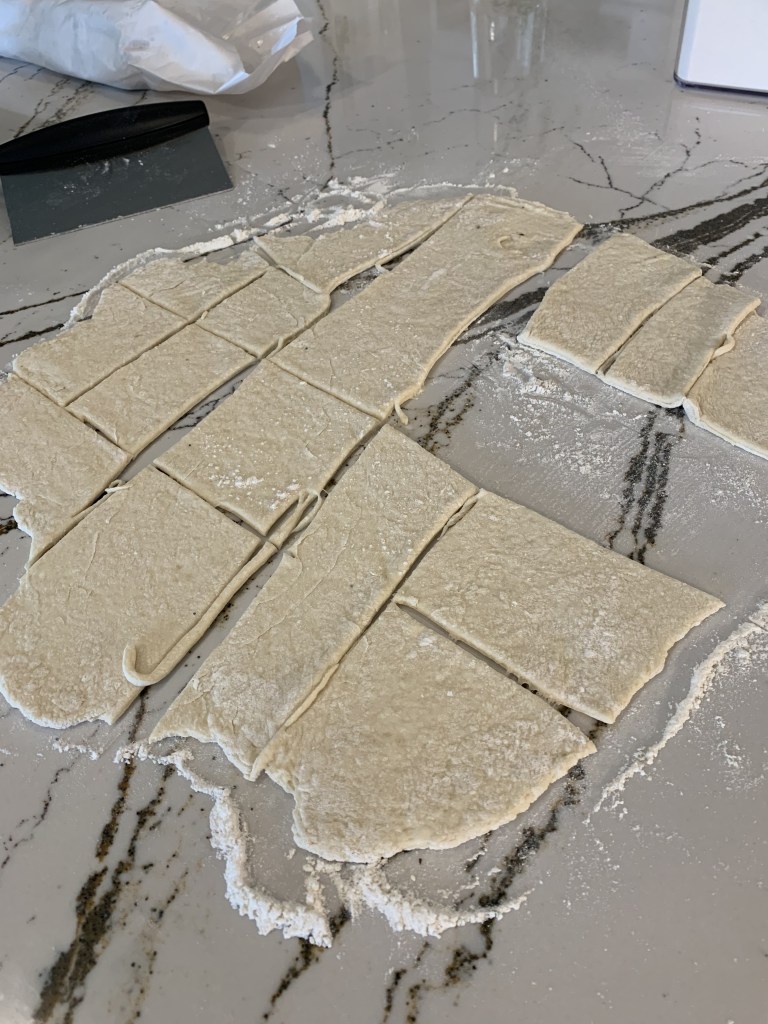 I followed the directions exactly on the box. You do need to be in a good mood whenever you make dough – so be happy! The dough is a nice, soft, wonderful dough!! Roll it out and cut into rectangles.