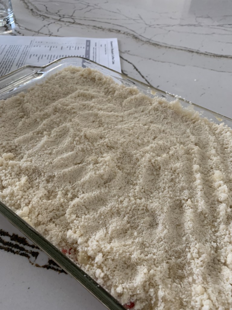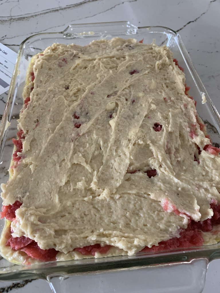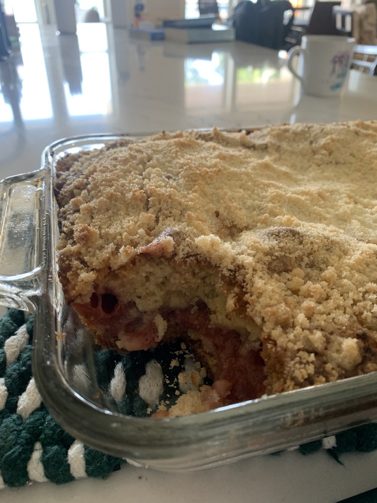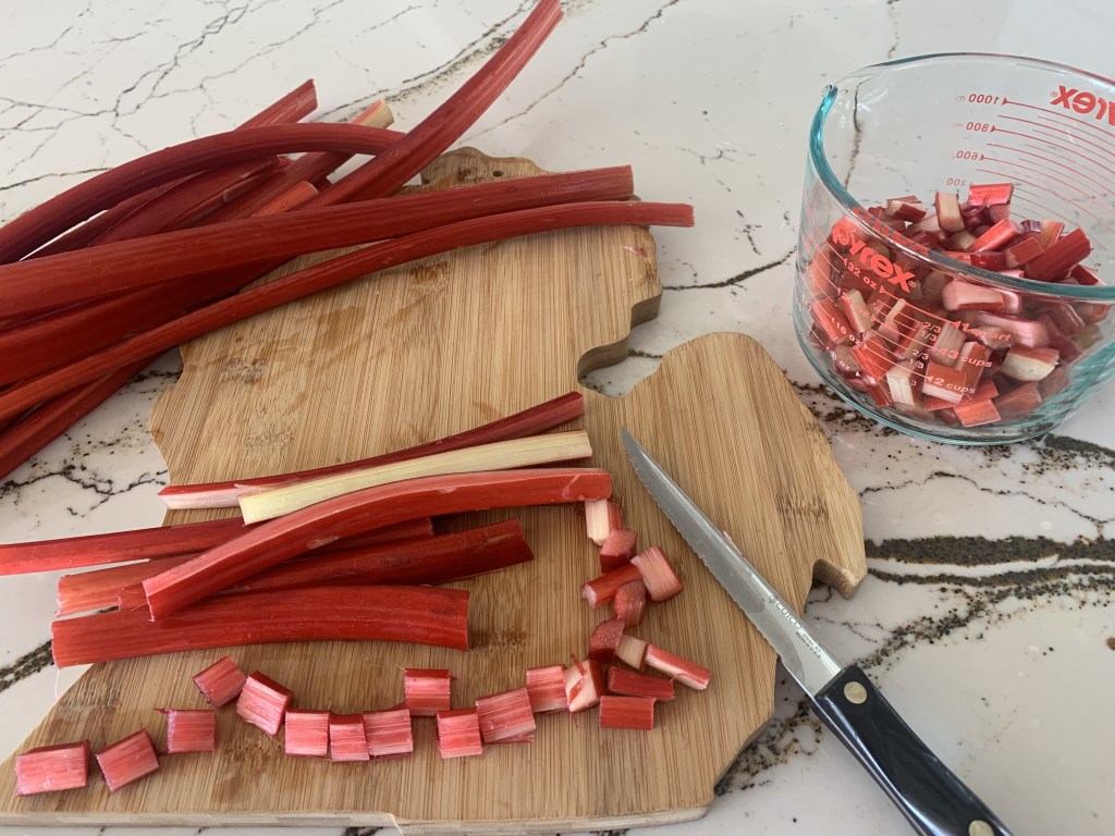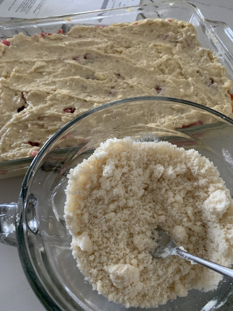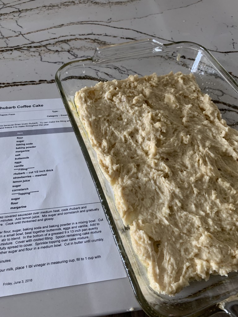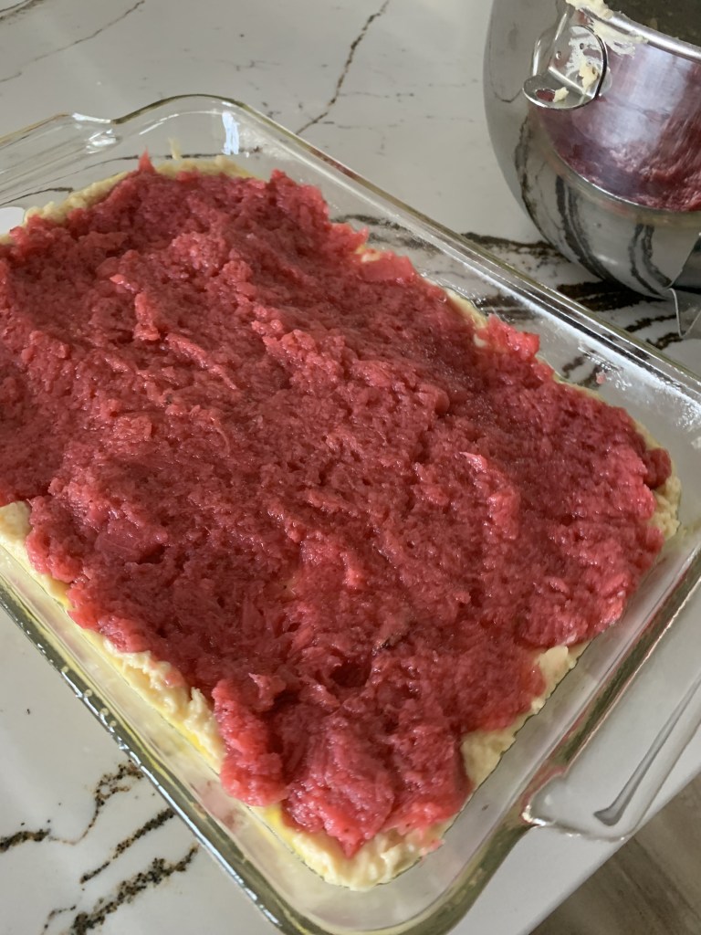 When I saw rhubarb in the grocery store, I had to get some to make my strawberry rhubarb coffee cake! It’s a family favorite! I like to make a couple batches of the filling and freeze it so I can make the coffee cake when rhubarb is not in season. Good to save the filling for when you want a red treat like for Christmas or Valentine’s day!
