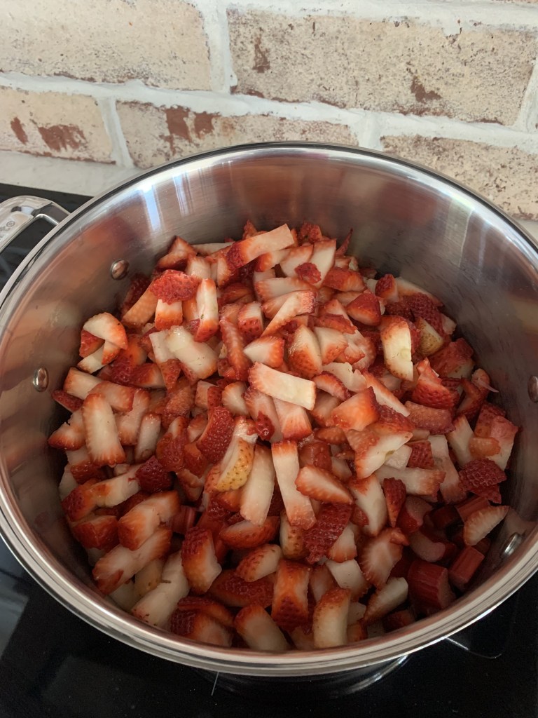FILLING: In a deep covered saucepan over medium heat, cook rhubarb and strawberries for 5 minutes. Add lemon juice. Combine sugar and cornstarch and gradually stir into fruit mixture. Cook until thickened and glossy.