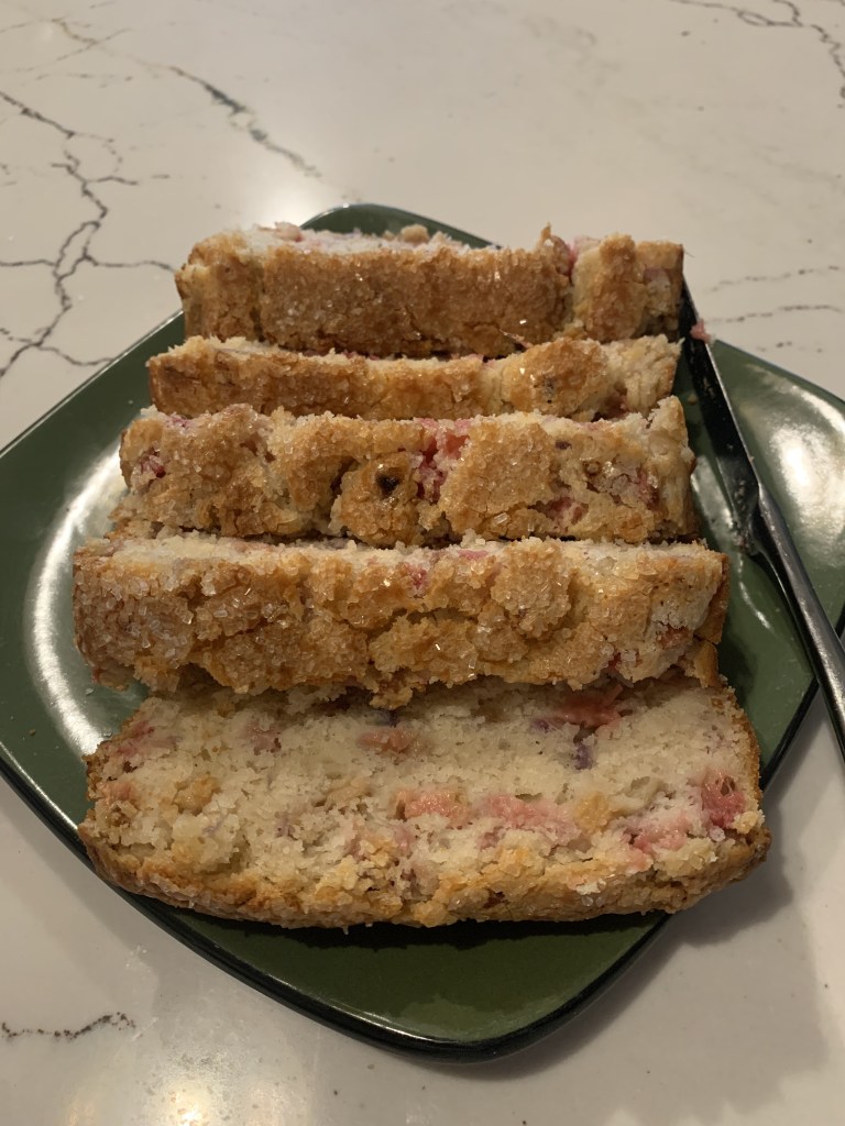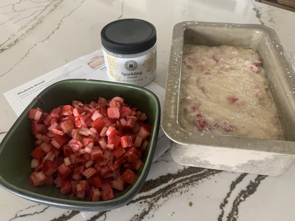 This is the rhubarb bread ready to go in the oven. I used King Arthur sparkling sugar on top. The rhubarb is chopped for the cake – I used my Simply Essential™ Veggie Chopper to dice it – it worked great!