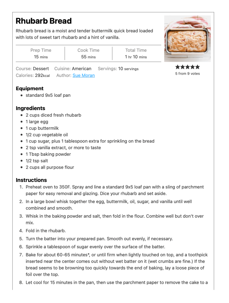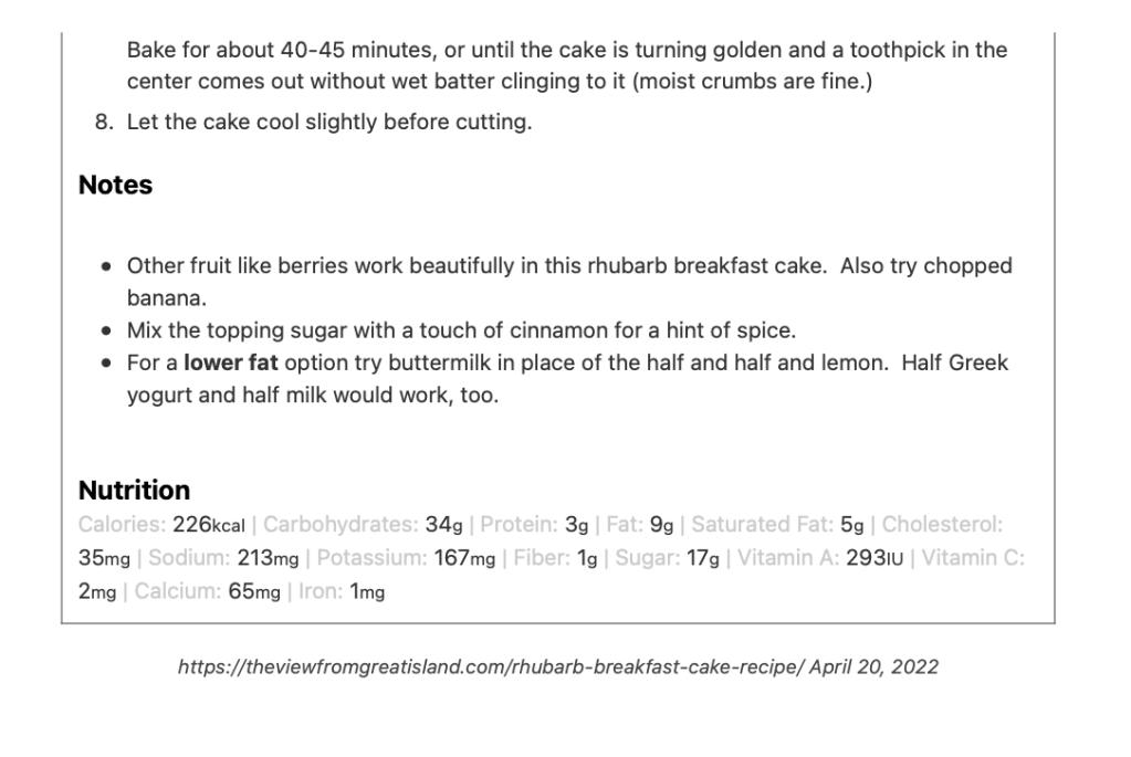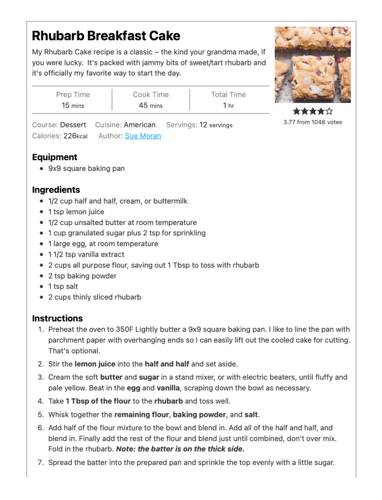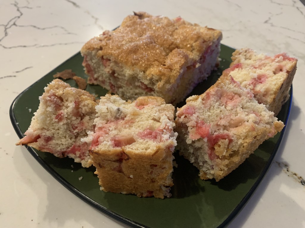 Both were very good. I could not tell a difference between them. The overall opinion was the crunchy sugar on top was a treat and the cake had more of it since it was made in a 9×9 pan instead of a bread pan- more surface area. So I’d say make either one, but do it in a pan so you have more surface to sprinkle the good sugar on top – it makes the rhubarb perfect! Enjoy!