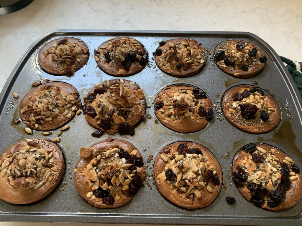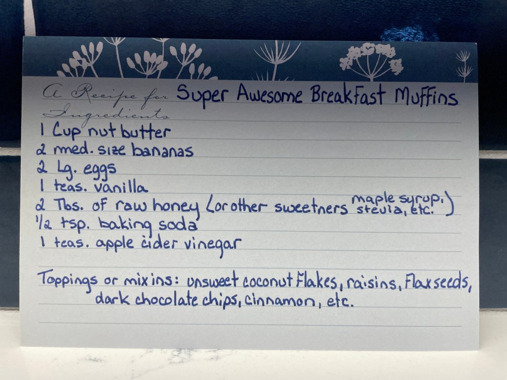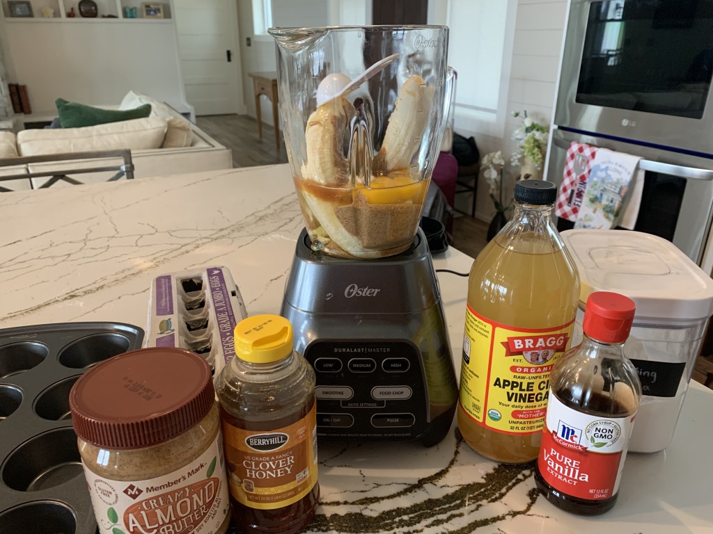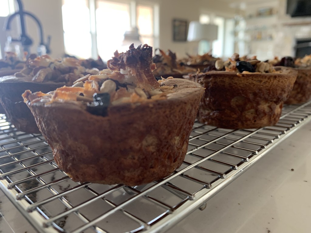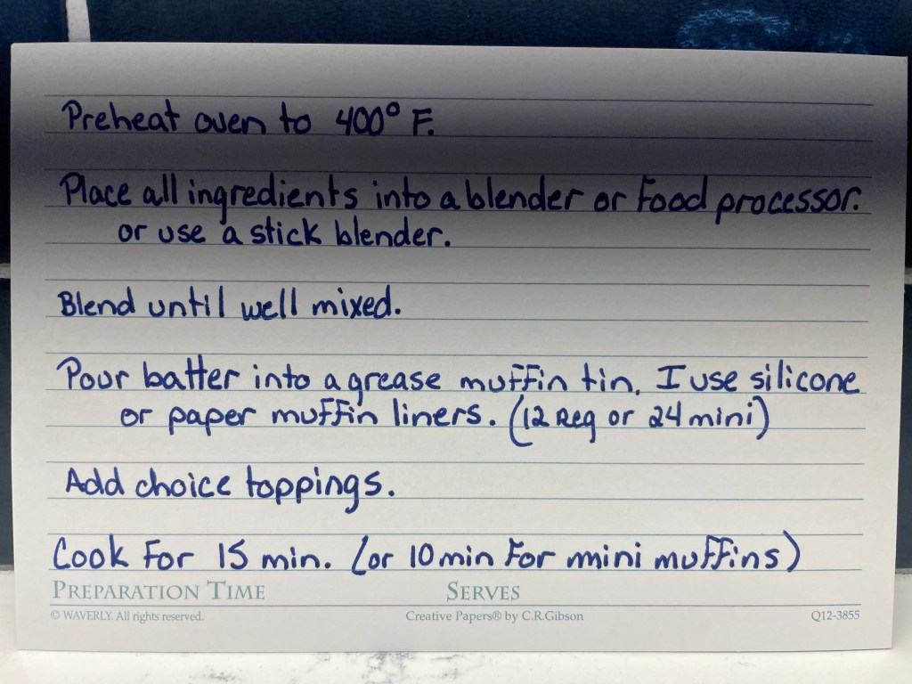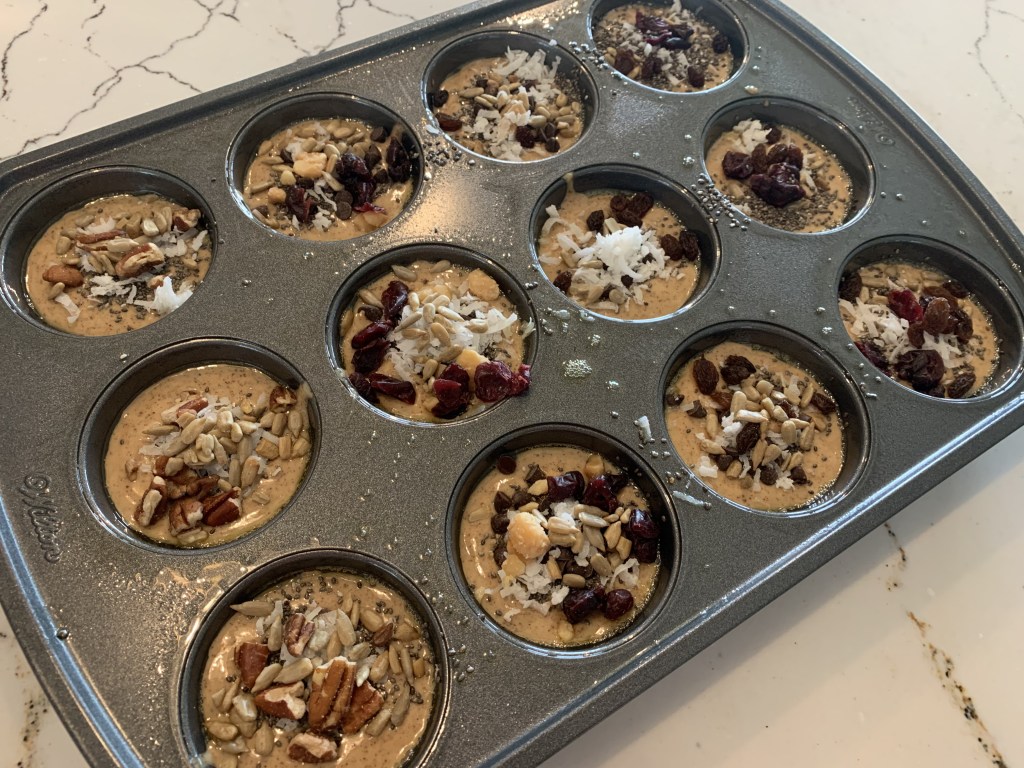 This is a great recipe made with no flour! You just mix the ingredients together in a blender and pour into the muffin tin. I sprayed the tins instead of using a cupcake holder. The recipe suggests adding toppings after you pour the batter into the pan. This is what I did and I made each one a little different. You could also make them all the same and stir the toppings into the batter before pouring. I like how they look with the toppings on top though! These are really good! Enjoy!