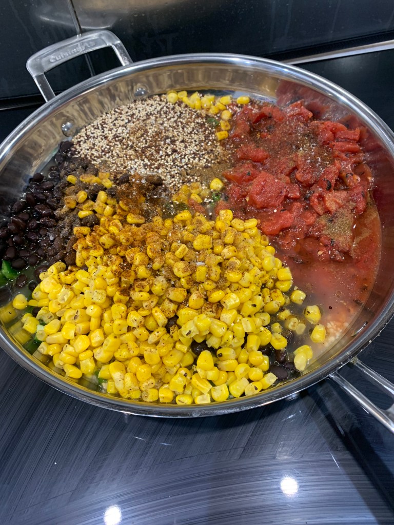 2 cloves garlic, minced 1 jalapeños, minced 1 cup quinoa (I like to use tri color because it’s so pretty!) 1 cup vegetable broth (I’ve used chicken also) 1 (15-ounce) can black beans, drained and rinsed 1 (14.5 oz) can fire-roasted diced tomatoes – do not drain