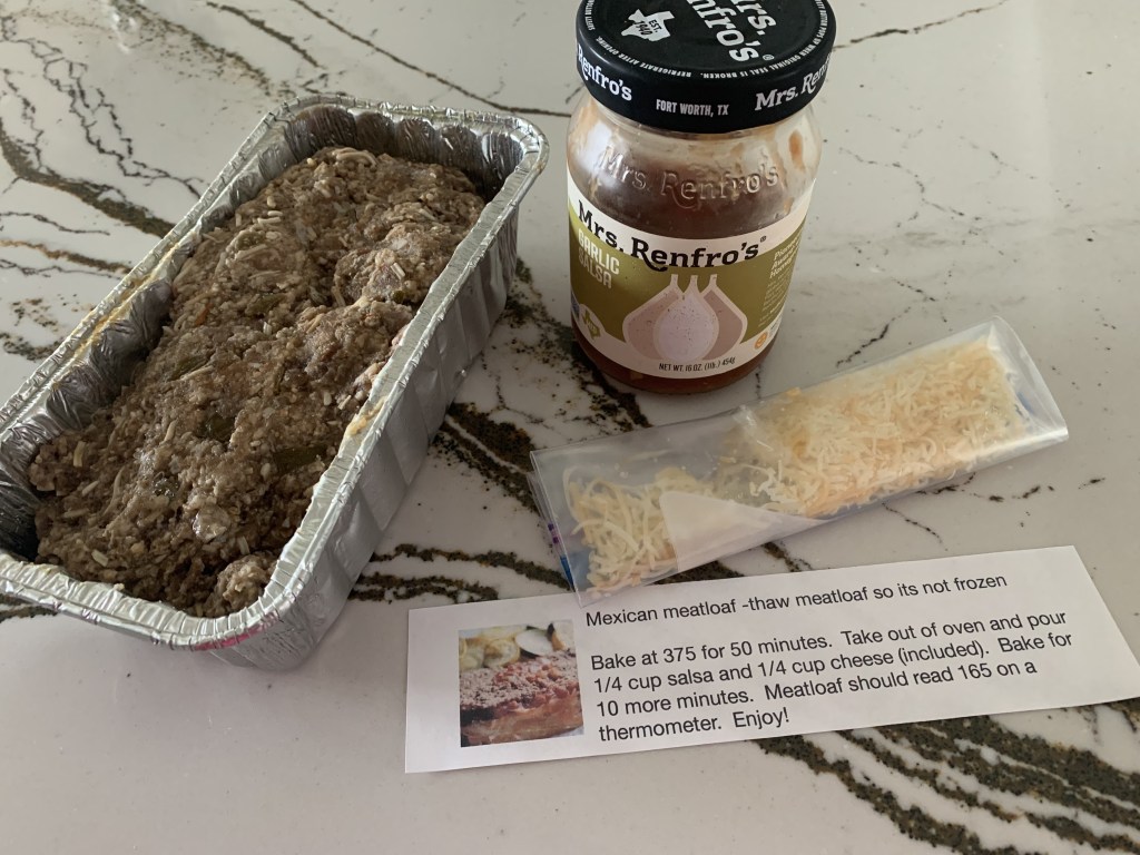 The ingredients are very basic, and you just dump everything together and mix. After it bakes for 50 minutes, you put 1/2 cup salsa and 1/2 cup cheese on top (1/4 cup of each on each meatloaf- recipe makes 2 meatloaves) and return to oven for 10 more minutes. It you don’t want the cheese, its still yummy without it. Super easy! I freeze the cheese in a separate bag and put with the meatloaf so I have it when I need it. I also type out the instructions and wrap that with the meatloaf too so I have it handy when I pull it out of the freezer.