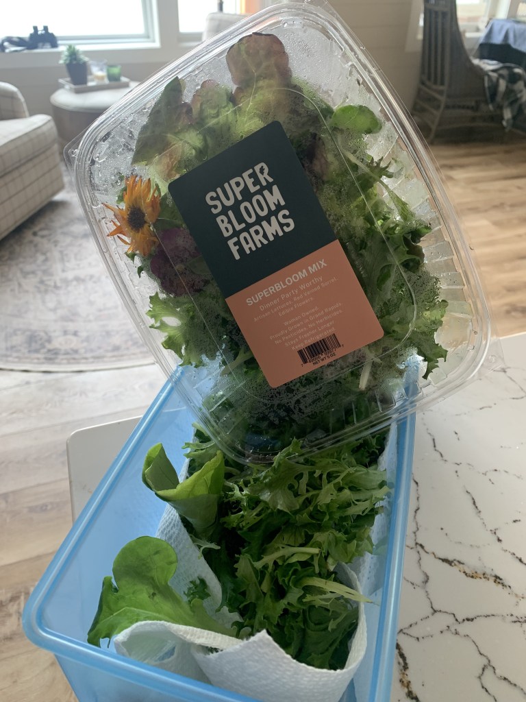 You can start with any greens. I like to use spinach and arugula but today, I tried a new company called Superbloom Farms. It’s a new woman owned, hydroponic farm in Grand Rapids! She grows lettuce, herbs and edible flowers. I heard her speak so wanted to try her greens! WOW! It was very yummy, and very pretty too! Check it out if you live in GR. Right now she is in Cascade Meijer, Gordon foods, Bridge Street Market and a few others…but she is expanding daily.