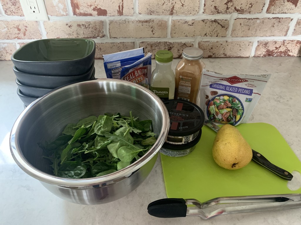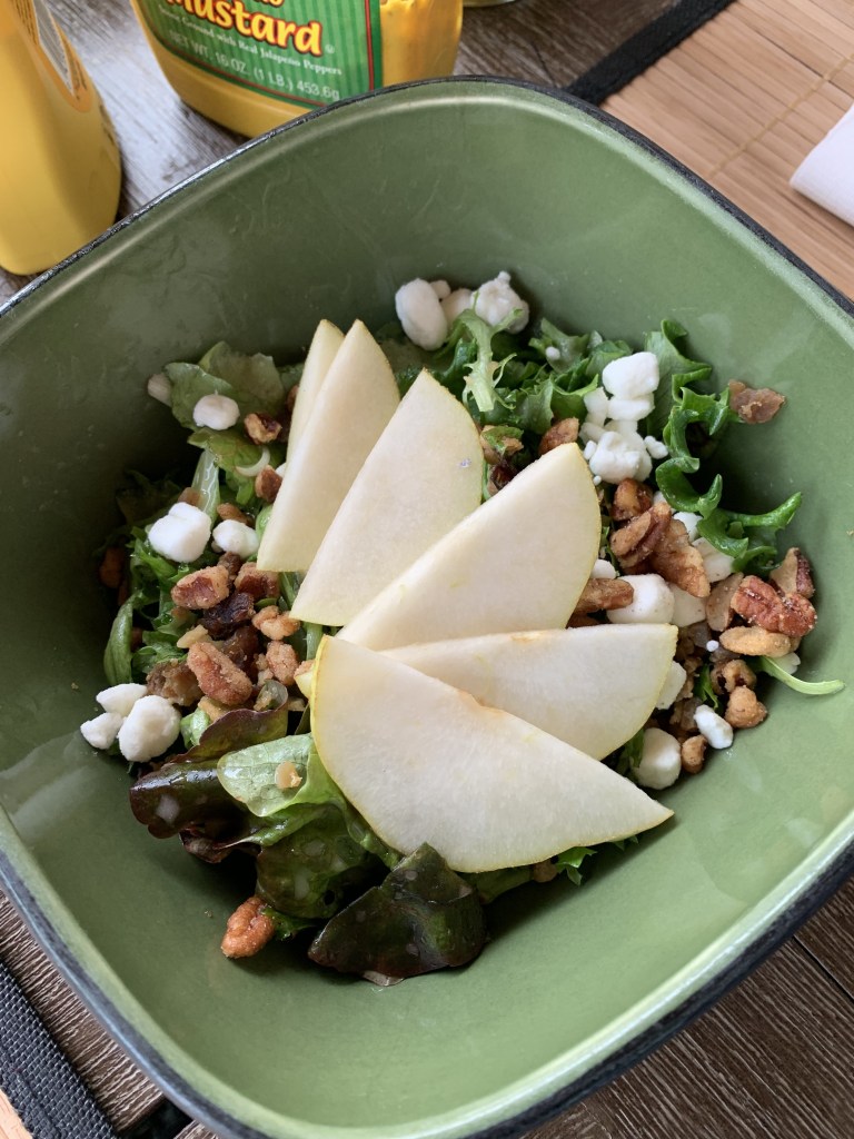 Put lettuce in big bowl and toss with any fruit dressing. I like to buy Panera Fuji Apple. You can use any vinaigrette that you like. Toss the lettuce with dressing and put in bowls. Top with bacon bits, goat cheese, sugared pecans and a sliced pear. You can sprinkle cinnamon on the pear too. This is also good with sliced apples. Enjoy! It’s so yummy!
