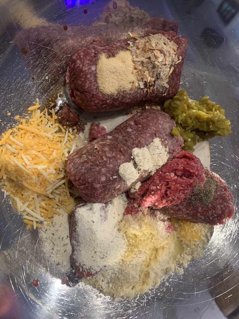 Assembling the ingredients. He uses bread crumbs, Ranch powder, onion soup mix, Worcestershire, green chilis, onion powder, garlic powder, egg, milk, cheese and salt and pepper.