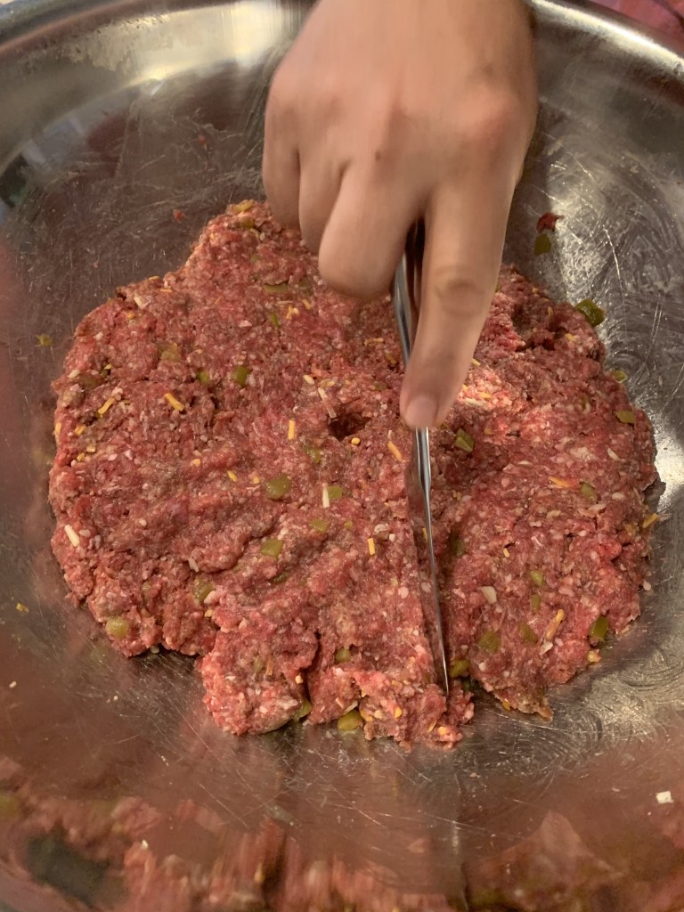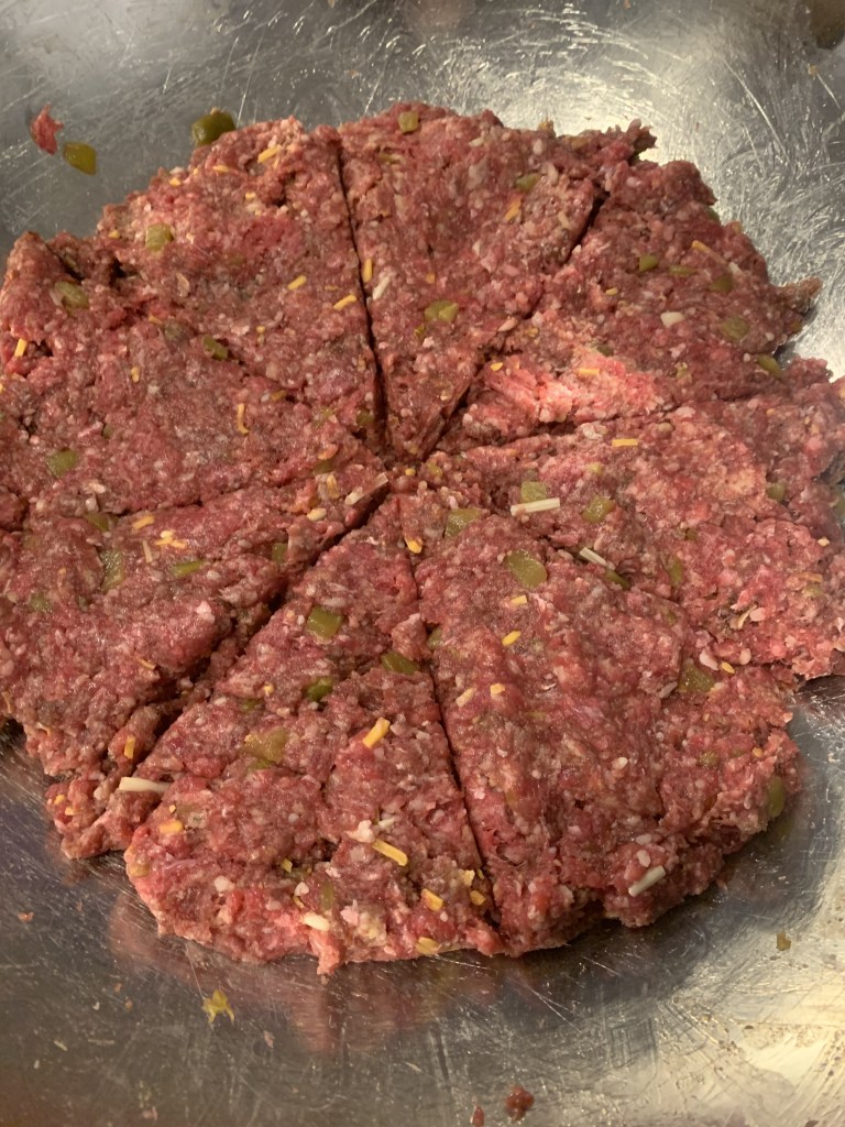 I think this is the cool part!! Press the ground beef into a circle on the bottom of your bowl and cut into the number of burgers you want to make – you cut it like a pizza!!