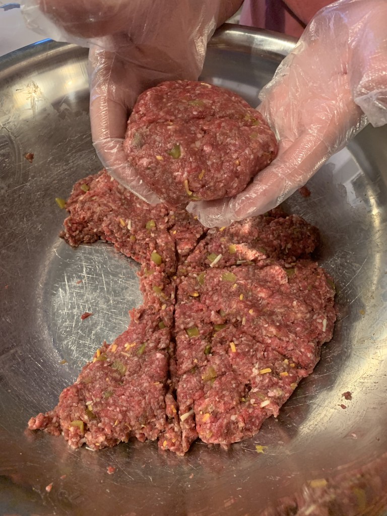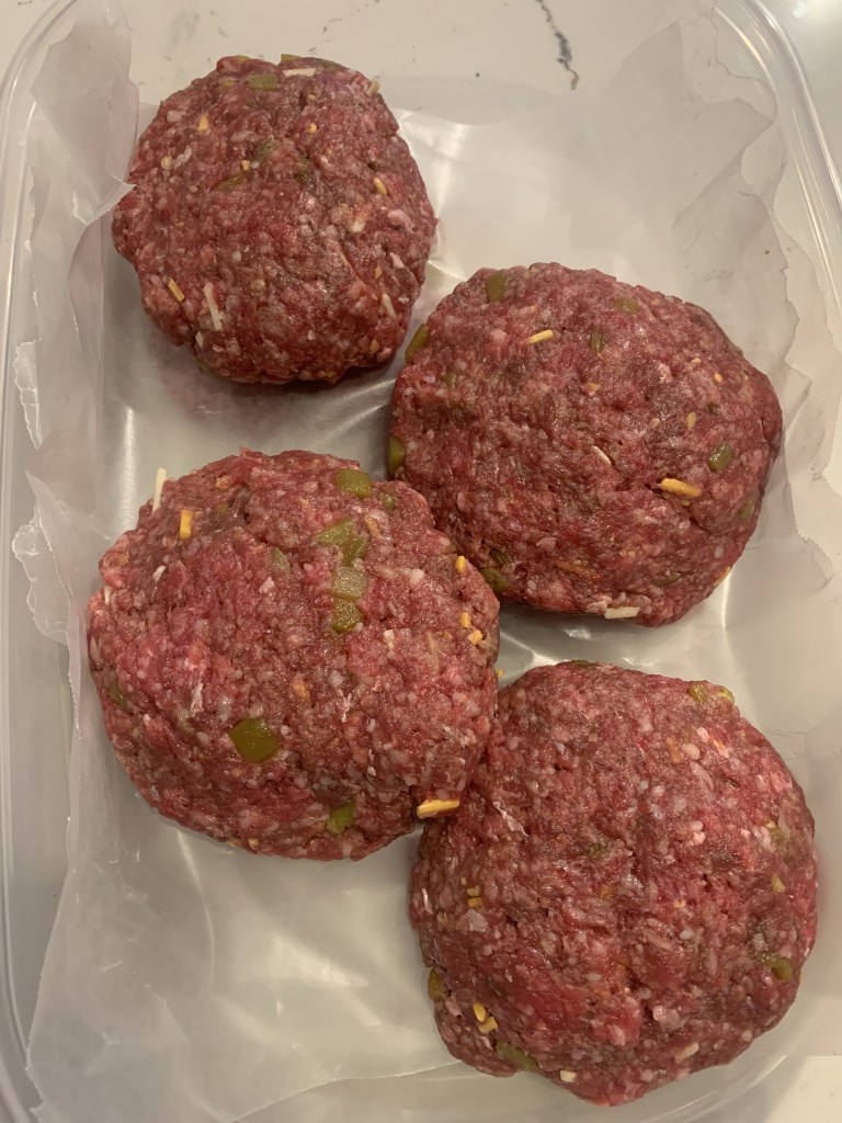 We made them the night before and stored them in the fridge. Each burger was 6 ounces. You don’t have to make them before, we just did so they were ready to go when we started dinner.
