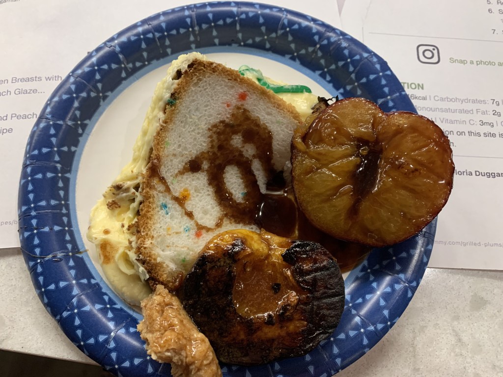 We decided we wanted to use peaches and plums. It’s a little early in the season, but I was able to find both at the grocery store. All you have to do is cut the fruit in half, get the pit out, brush with oil (We used coconut oil) and grill flesh down until soft (3-5 minutes)