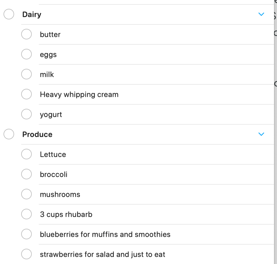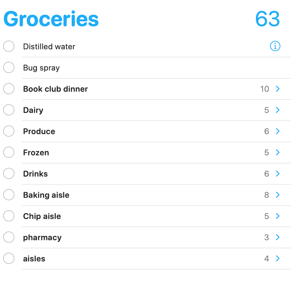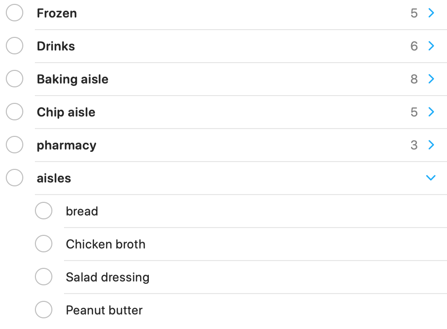 Before I head to the store, I organize my list. I’m a shopper, so I know the grocery store pretty well. I put my list in order of the store so I don’t spend time back tracking. Reminders allows you to make folders and that is really helpful. I start with the main areas: produce, dairy, frozen, etc.