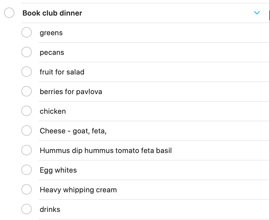 When I have a specific thing that I have to shop for, I create an event for that first. You may have noticed that the first list had “Book club dinner” as one of the items. I listed everything I want to make in that list first and then drag and drop to the correct folder for when I’m shopping.