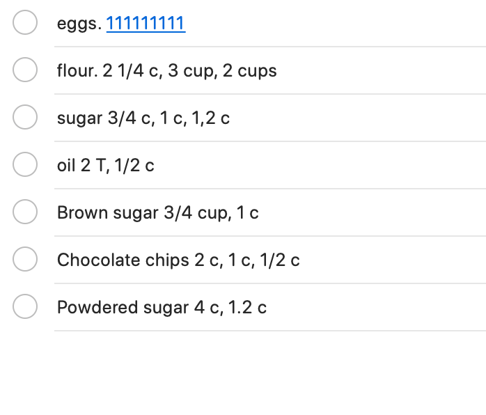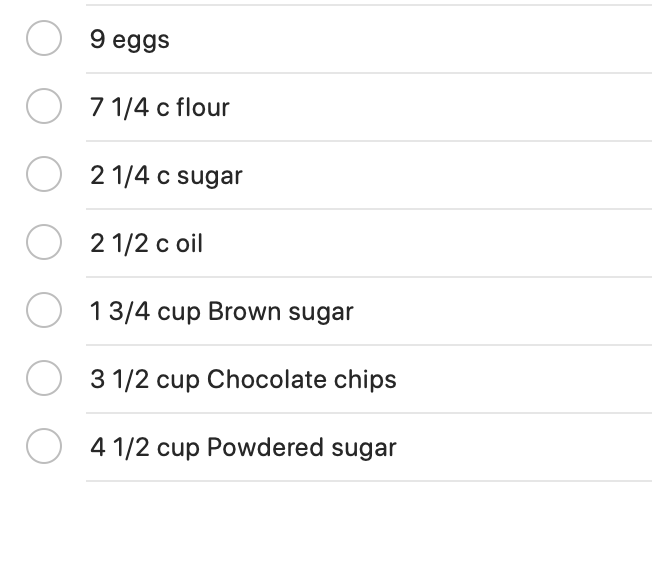 When I’m making my Christmas cookie baking, I go over all my recipes and mark on my list what I need and how much. It takes a little bit of time to do this for big baking (I make about 24 different cookies) I write down what I need for my first recipe and put the amount. Then the next recipe, I add the amount I need. When I have all the ingredients and amounts written down, I add them up and drag and drop them on my list in the category to purchase. It’s hard to determine how much flour you need when baking that much so this really makes sure I don’t run out of anything.