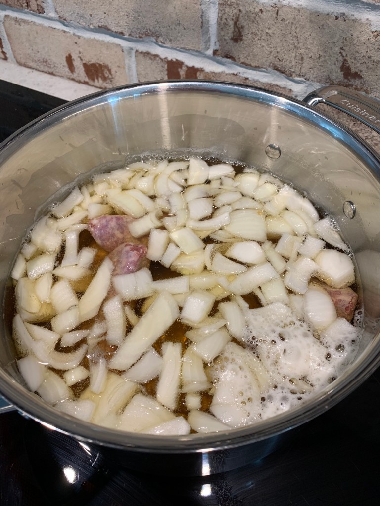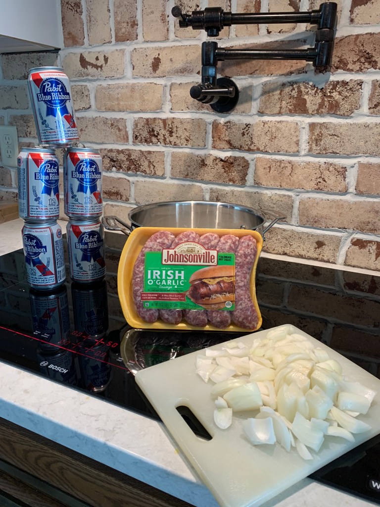 His favorite brand is Johnsonville. When we went to the store, we saw they had Irish O’Garlic version! We had to try them. You pour beer into you pot and fill it full enough for how many brats you are making. You want the brats to be covered and be able to cook in the beer. You also add an onion to the pot. Heat on the stove until brats are cooked. It’s ok to let them sit in the beer if you’re not ready to cook them right away.