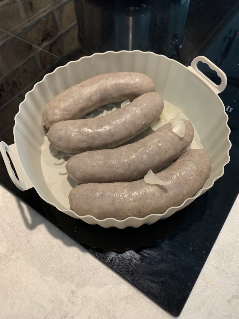 This is how they will look. We usually grill them, but we decided to try them in the air fryer. (I use the silicon liner for our air fryer – which is a life changer for cleanup! Bought it on amazon.)