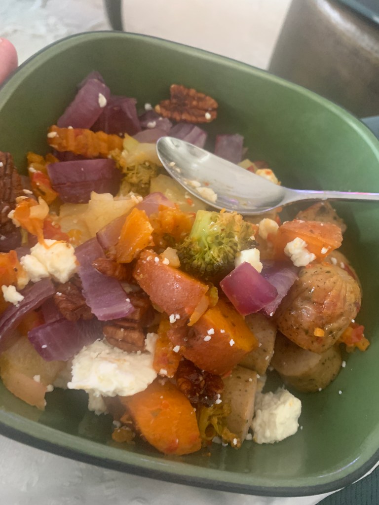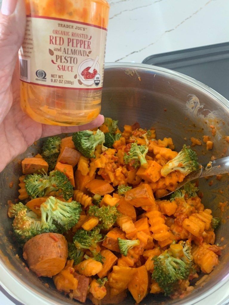 You start by cutting up 2 sweet potatoes, add a container of butternut squash zigzags and 2-3 cups broccoli. (You don’t really need the zigzags from TJs, you can just cut up butternut squash. I would also add more broccoli since it really shrinks up when you bake it. I felt like the final dish did not have enough broccoli in it. ) Put all in a bowl and toss with Trader Joe’s Red Pepper Pesto. (I think this would be amazing with any pesto so don’t feel like you need to use the red pepper. Also, the red pepper is not spicy – just fyi) Spread out on a prepared baking sheet and sprinkle with salt if you wish.