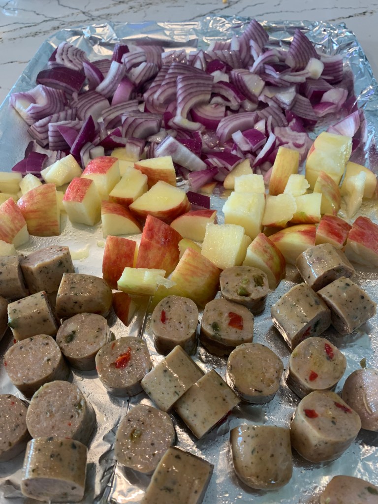 While that is baking, take another baking pan and chop up one red onion, 1 honey crisp apple and 1 package of chicken sausage. I got my chicken sausage at Trader Joes and I bought the jalapeño flavored. I really liked the little bit of spice. You can use any sausage you like though. Drizzle onion, apple and sausage with olive oil.