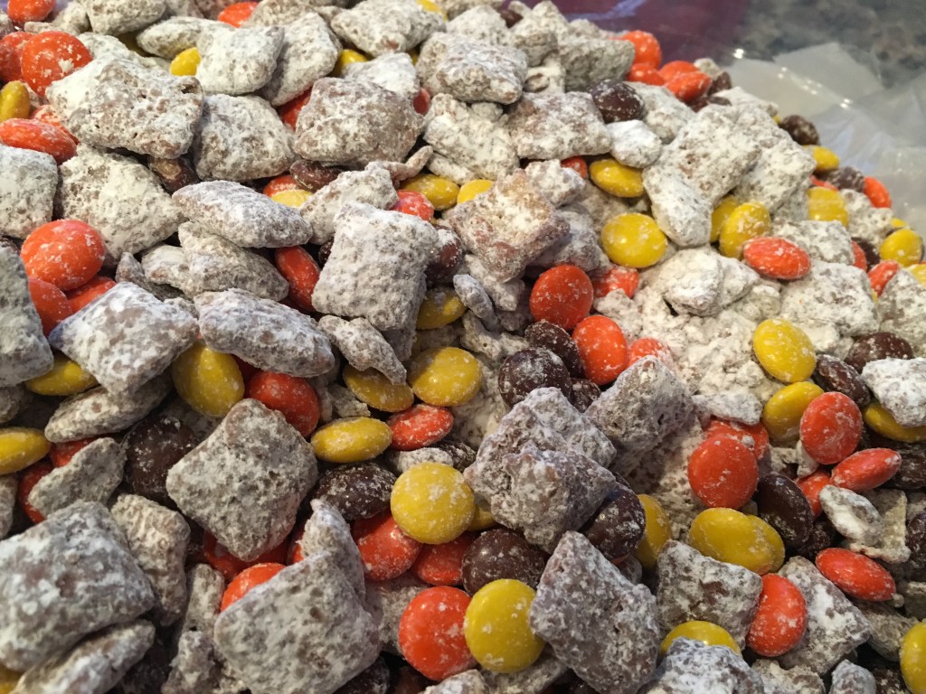I like baking every day treats and changing them slightly by ingredient or decorating to match the season. For Puppy Chow, I added Reese pieces! It instantly looks like Fall and it just adds to the amazing peanut butter flavor!