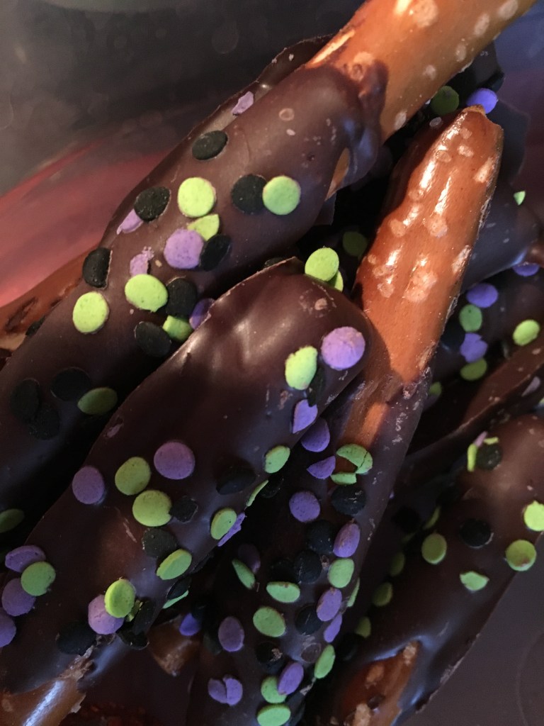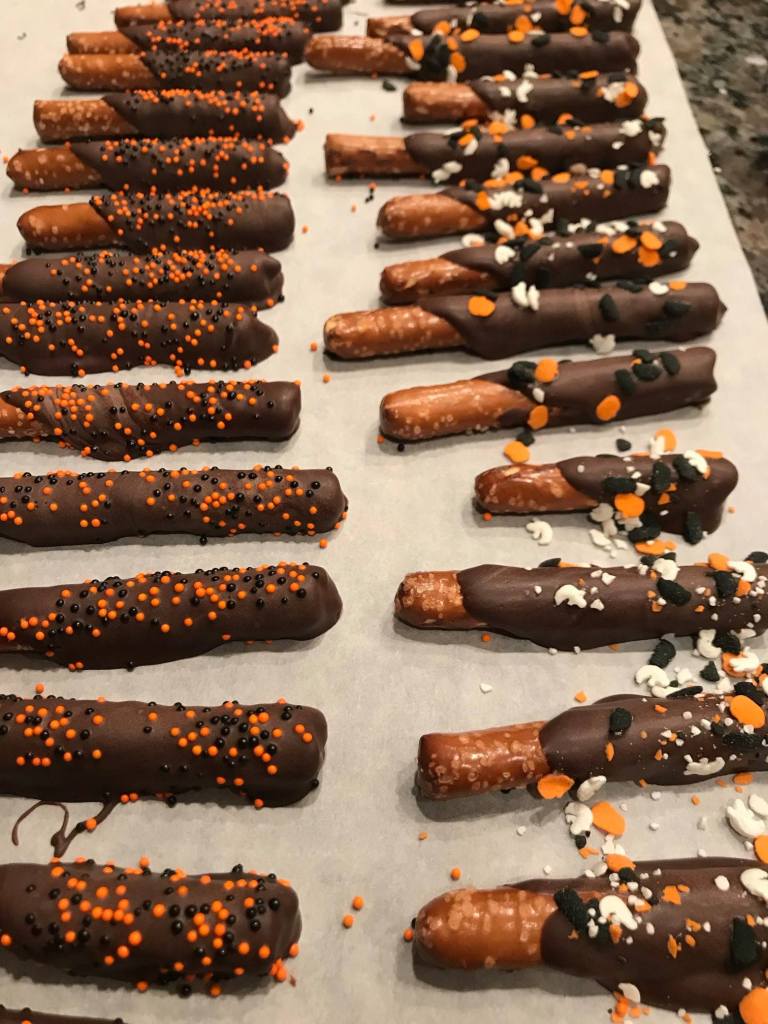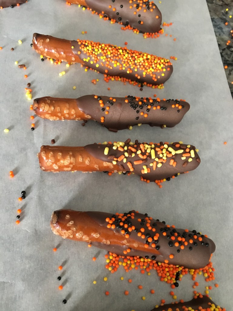 I buy the pretzel rods and I break them in half and dip the broken end into the chocolate. I then sprinkle Halloween/Fall sprinkles on them. You could get fancy and drizzle with another color candy melt, carmel, or anything you have. You could also use other goodies beside sprinkles like mini marshmallows, mini chips, glitter or really anything. It’s a quick easy treat that you can make as the chocolate hardens really fast. Store in an air tight container. Enjoy!