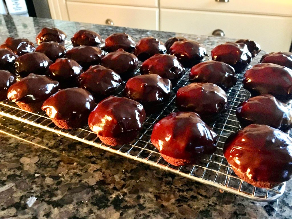 Like most recipes, you combine dry ingredients and you combine wet ingredients and you then mix together until just combined. Add chocolate chips and fold in. I sprayed the muffin pan so I didn’t have to use liners. The recipe suggests that if you use a bread pan, after praying it, line it with parchment. The ganache on top of this chocolate pumpkin bread is so good! You just heat the cream, add the chips and mix until combined and glossy. I dipped each muffin into the ganache. I think they turned out so pretty and look decadent! See link for recipe. Enjoy!