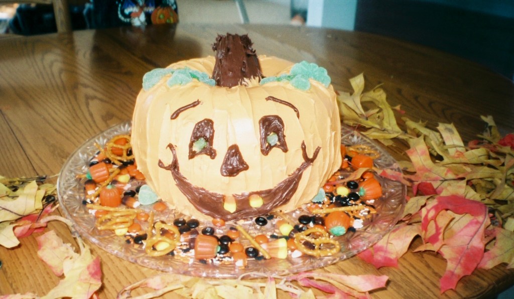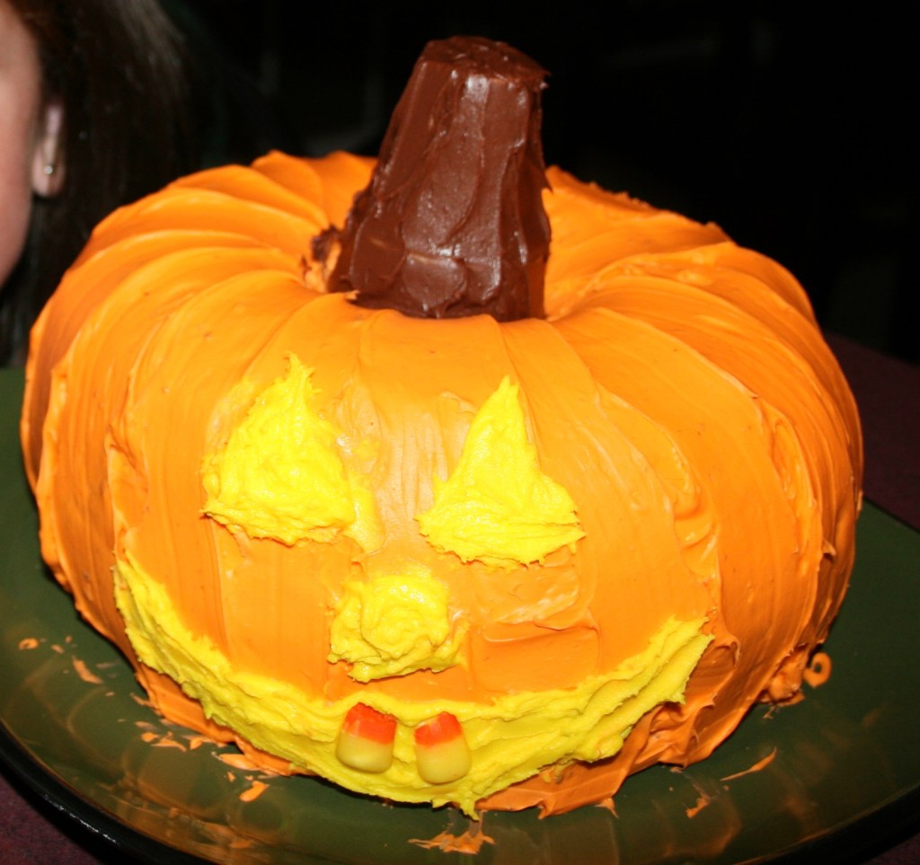 Frost so you have the groves going down so it looks like a pumpkin. Frost an ice cream cone with chocolate fudge frosting and set on top as a stem. You can use remaining fudge frosting to make face, or color frosting yellow. Put frosting in a bag and snip the corner to draw face. Use candy corn for teeth. Buy green fruit candy slices or sugared jelly candy to make leaves. You can roll it out and cut leaves with a knife or scissors.