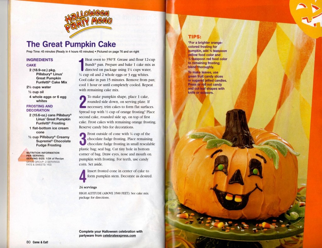To make the pumpkin, you place one cake upside down (round side down) on a serving tray. If you need to, trim the cakes so there is a flat surface on both so the cakes will frost together. If you cant find orange frosting (sometimes they have it as a seasonal item) you will need to buy white or buttercream, or whatever you like, and color it orange. If you can find orange food color that works, but you can also use yellow and red. It takes a lot of food coloring to create a nice orange color. Spread frosting on top of first pumpkin and place second one on top to make pumpkin shape. Frost the pumpkin with remaining frosting. I always find that I don’t have enough frosting, so I would suggest 3 cans. Thats just me though, I like a lot of frosting, so I end up not having enough to cover the cake.