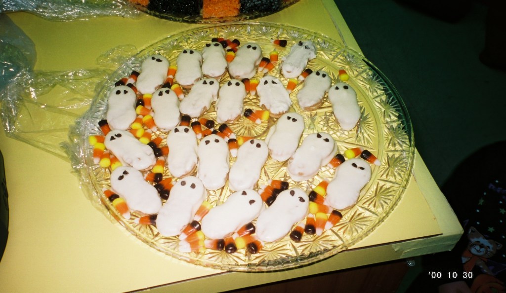 Dip the nutter butter cookies in the melted white candy quick. Use mini chocolate chips for eyes! DONE!