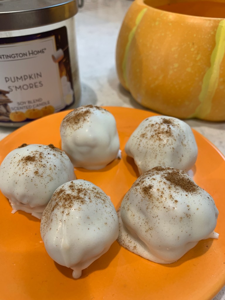 Make 28 one tablespoon size balls out of the dough. Melt white almond bark in microwave. Cover a cookie sheet with parchment. Dip each ball into the white chocolate and sprinkle with pumpkin pie seasoning.