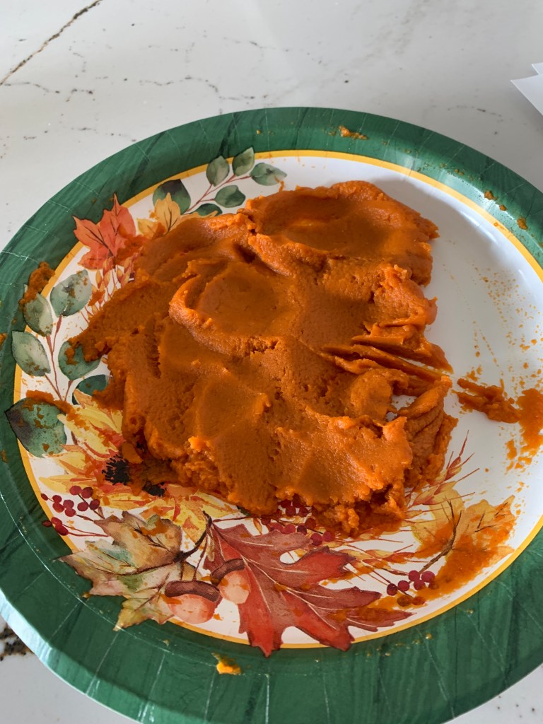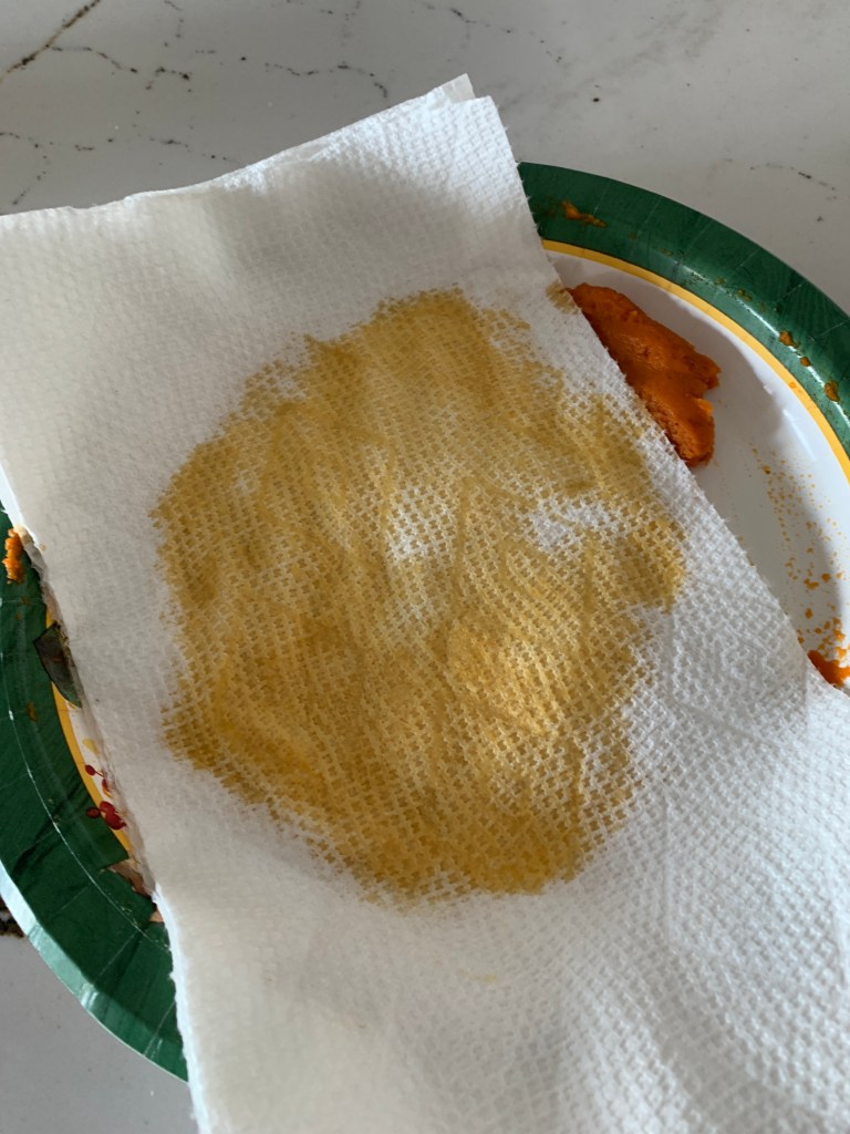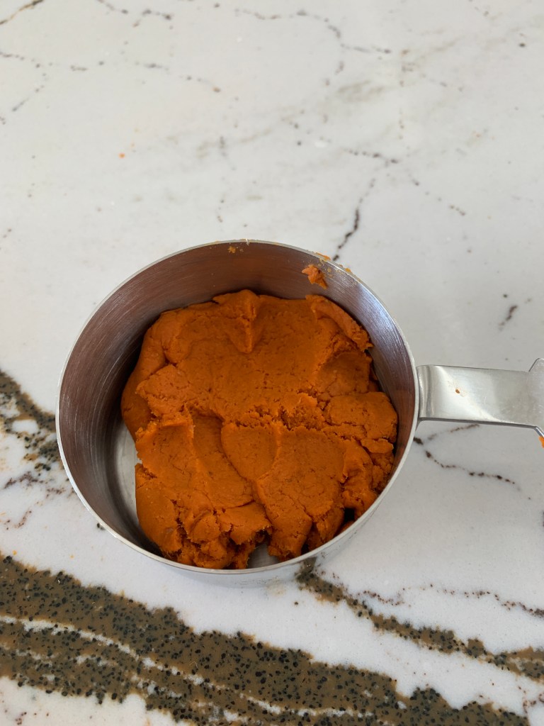Next you need to put the pumpkin puree on a paper plate with paper towels and try to get all the water/moisture out of the puree. It works best to spread out the puree, press paper towels on it and then mix up and respread the puree and press with paper towels again. I did this about 5 times. It will feel like soft play dough and will measure about 1/3 cup.
