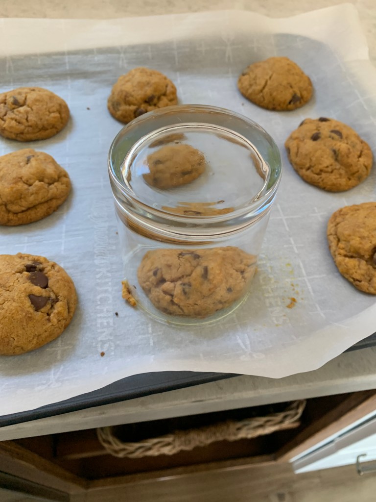 Bake for 9-13 minutes. As soon as they come out of the oven use the glass trick. You put the glass over the cookie and move it around to make perfectly round cookies. This only works fresh out of the oven when the cookie are still hot.
