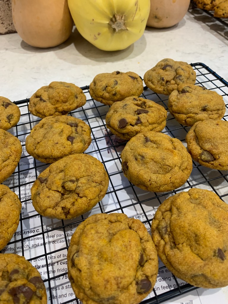 Fold in the flour, pumpkin pie spice, baking soda, salt, and chocolate chips.