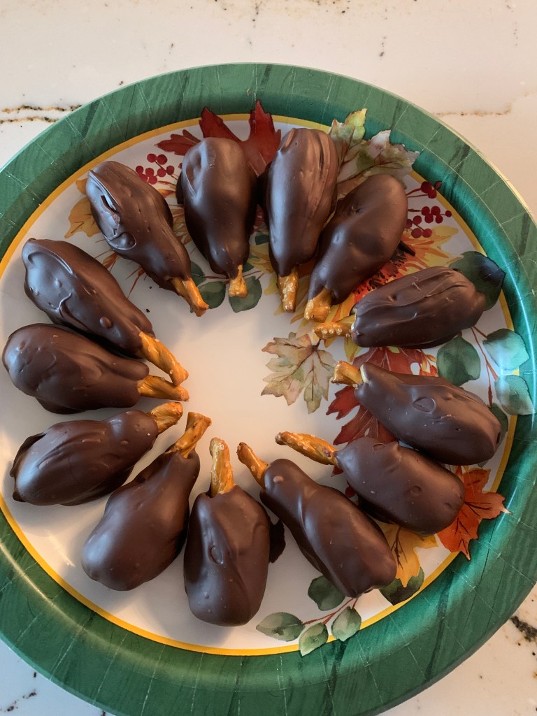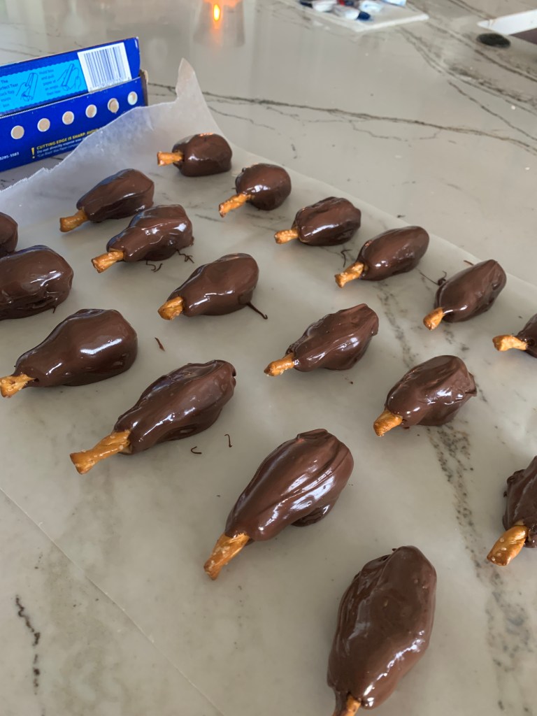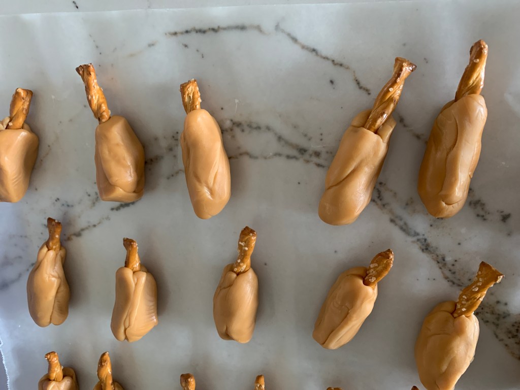 You mold 2 carmels around each pretzel to look like a turkey leg.