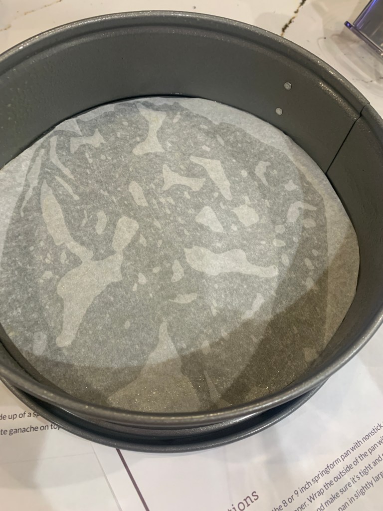 To prepare your springform pan, you need an 8 or 9 inch pan. Spray with PAM and then line the bottom with parchment .