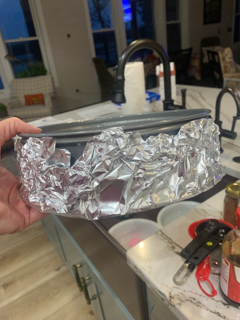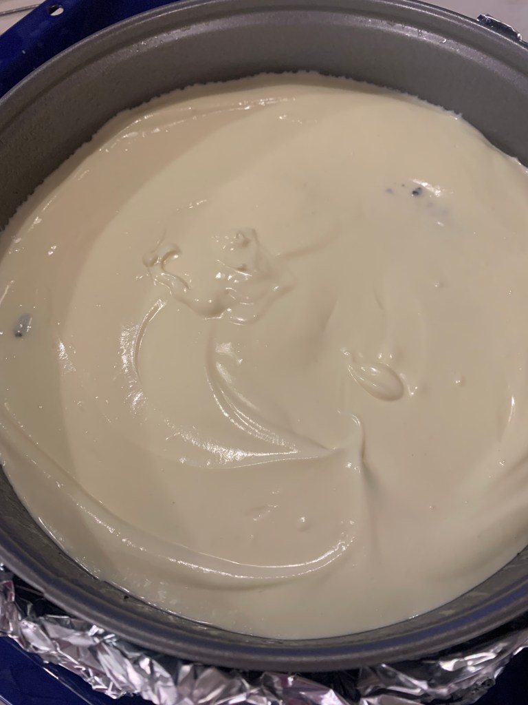 Then you need to wrap the bottom with foil very securely because you will bake the cheesecake in another pan with water in it and you don’t want the water to get in the cheesecake.
