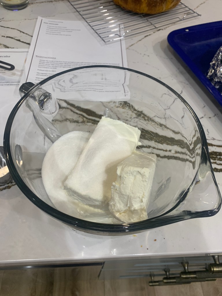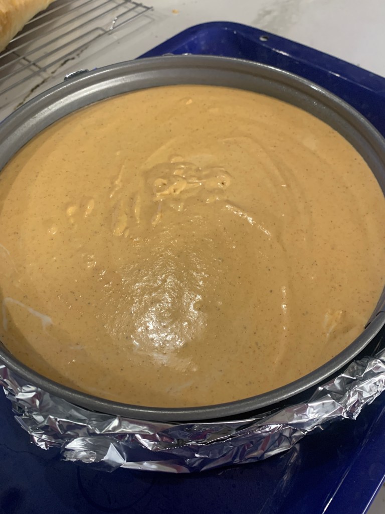 Place the pan in a roasting pan and fill the roasting pan with water about 1/4 of the way up. Bake at 350 for 55-60 minutes (Although mine took about 1 1/2 hours) You know it’s finished when the sides pull away and the center is set. Remove pan from water bath and let cool. Remove foil and put in fridge overnight or for at least 5 hours. When it’s cool, run a knife around the edges and remove the sides of the pan.