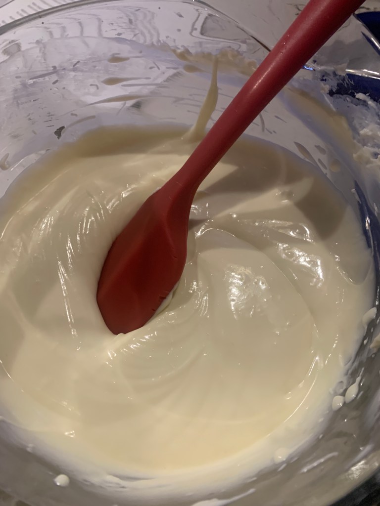 While the cake is in the freezer, make the ganache. The directions say to melt the chocolate and add the whipping cream but I’ve always heated the whipping cream and added the chocolate. The biggest thing here is the ganache has to be totally cooled or it will melt the whipped cream.