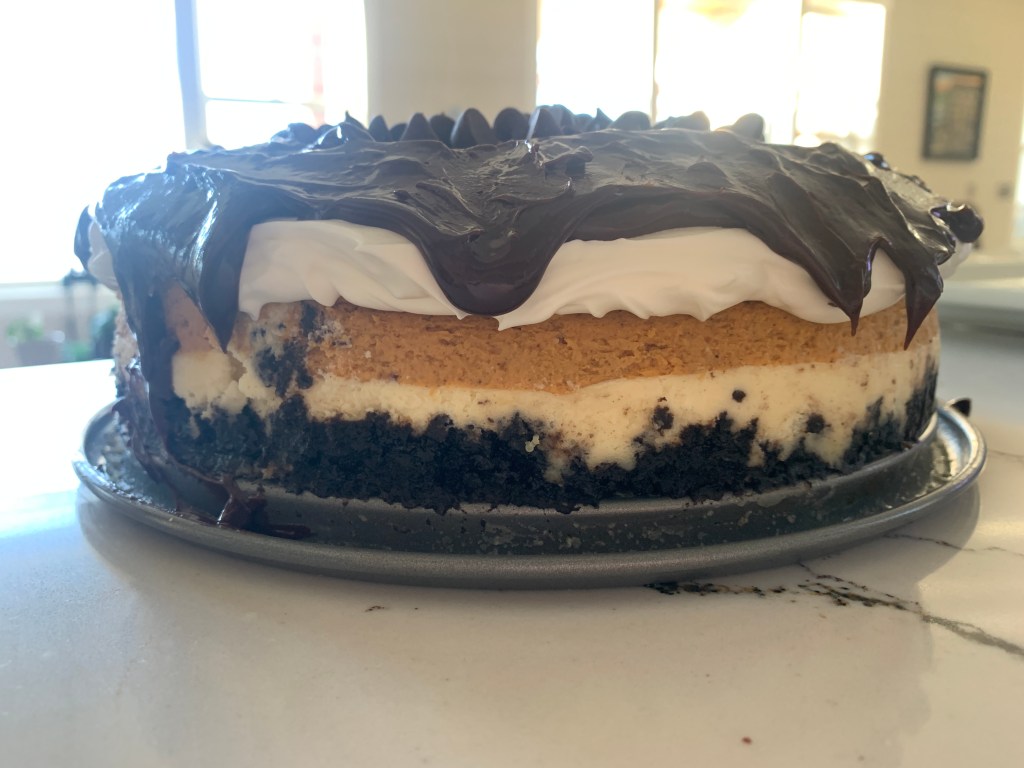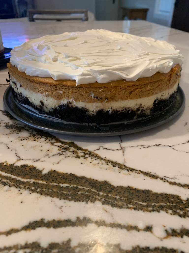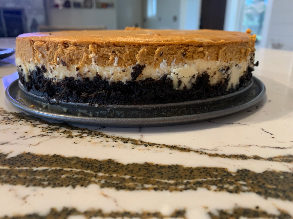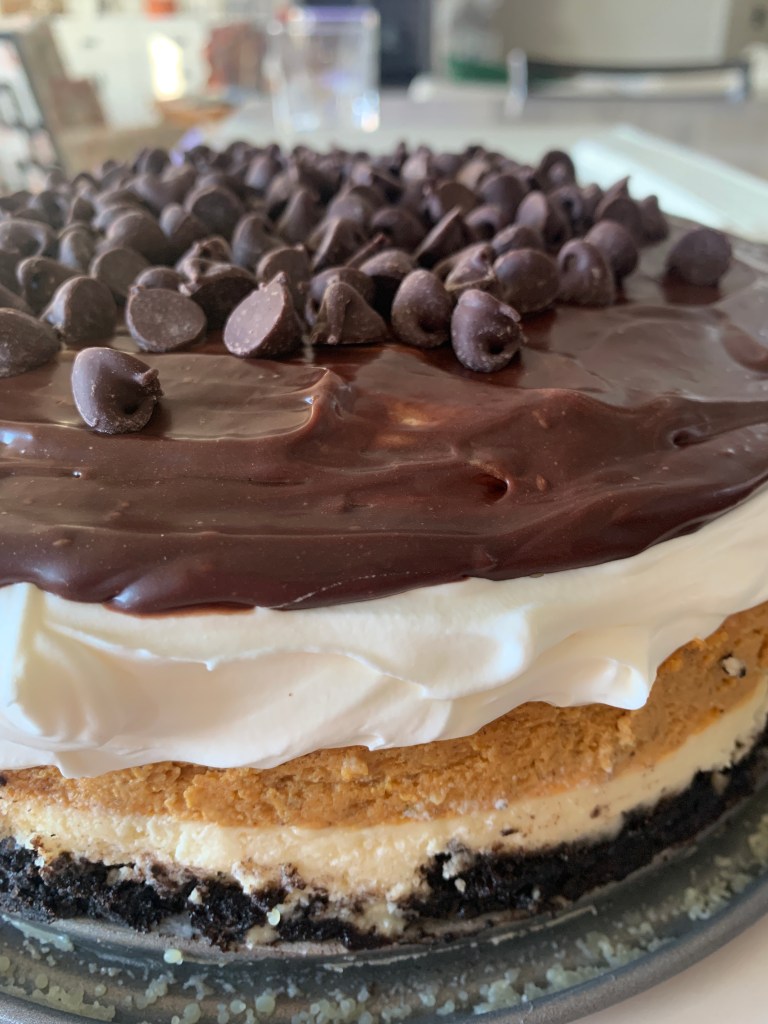 I saw the photo of this cake and knew I had to try it! It has an Oreo crust – YUM – and two layers of cheese cake, one plain and one pumpkin. Then you top it with ganache and whipped cream! How could I not try this?