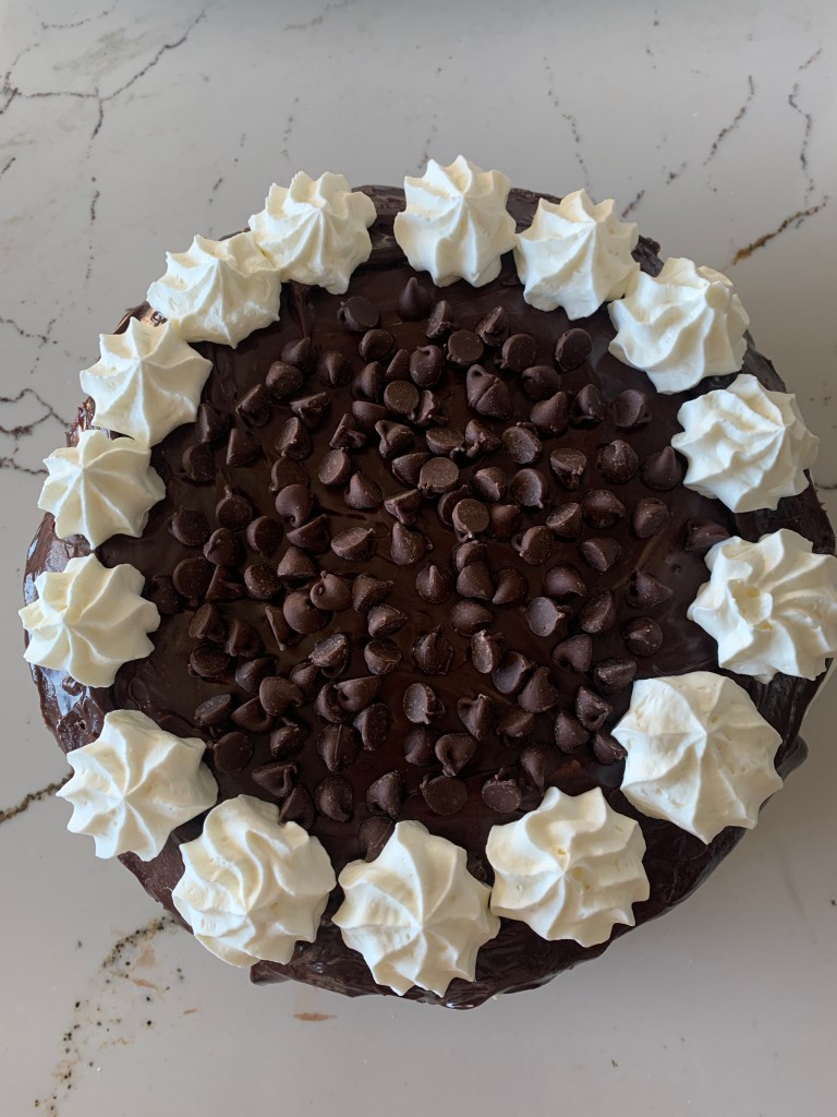 I added the chocolate chips too. Then you stick it back in the freezer for about 5-10 minutes. Reheat the ganache so you can pour it around the sides to have it drip over the edge. Let it cool completely to set and decorate with whipped cream.